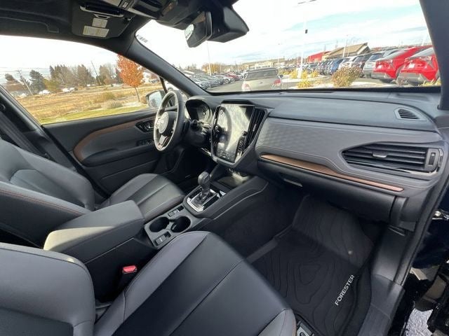 The leather seats in this unit are a must for buyers looking for comfort, durability, and style. Bluetooth® technology is built into this 2025 Subaru Forester , keeping your hands on the steering wheel and your focus on the road. See what's behind you with the back up camera on this Subaru Forester. Apple CarPlay: Seamless smartphone integration for this vehicle - stay connected and entertained on the go! This 2025 Subaru Forester keeps you comfortable with Auto Climate. The Subaru Forester offers Android Auto for seamless smartphone integration. This mid-size suv has auto-adjust speed for safe following. It stays safely in its lane with Lane Keep Assist. Control your garage door with its built in HomeLink System. This mid-size suv has an elegant black exterior finish. Load groceries and much more with ease into this model thanks to the power liftgate. This mid-size suv has a 4 Cyl, 2.5L high output engine.
